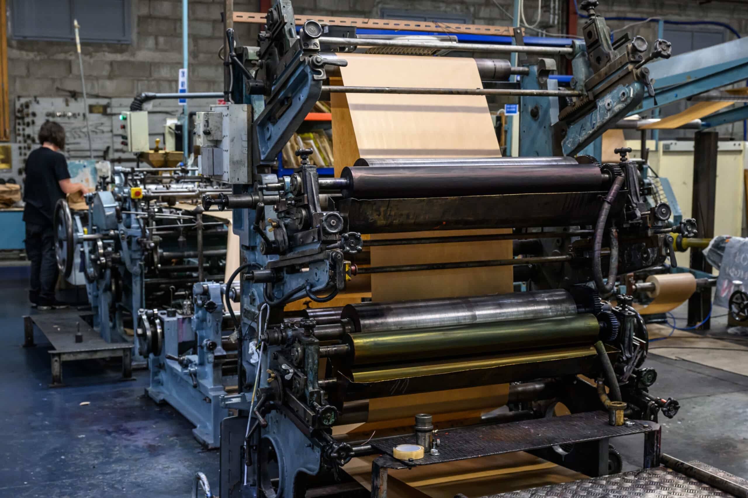 Une fois que la machine est réglée, elle entre en fonctionnement et enchaîne les différentes étapes de réalisation d’un sac en papier, la première étant l’impression. Une fois le papier imprimé, il est ensuite plié et collé pour former les côtés du sac en papier : c’est ce que l’on appelle le façonnage. Enfin, la machine vient découper le papier pour former le sac final.